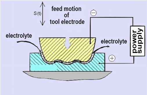 - an electrochemical machining process using the principle of anodic material removal located in an electrically conductive medium.
